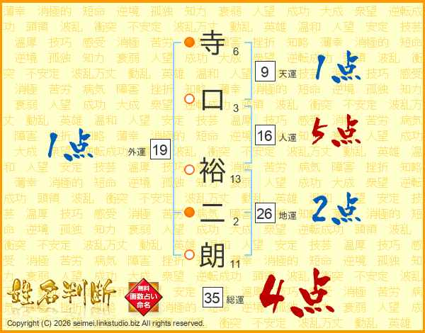 寺(6画)口(3画) 裕(13画)二(2画)朗(11画)