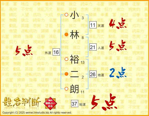 小(3画)林(8画) 裕(13画)二(2画)朗(11画)
