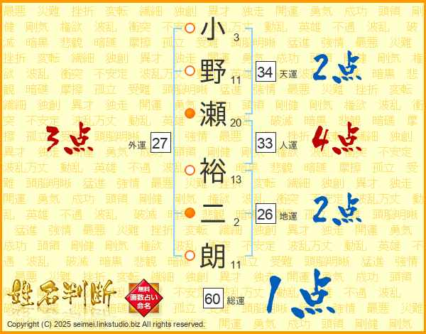 小(3画)野(11画)瀬(20画) 裕(13画)二(2画)朗(11画)