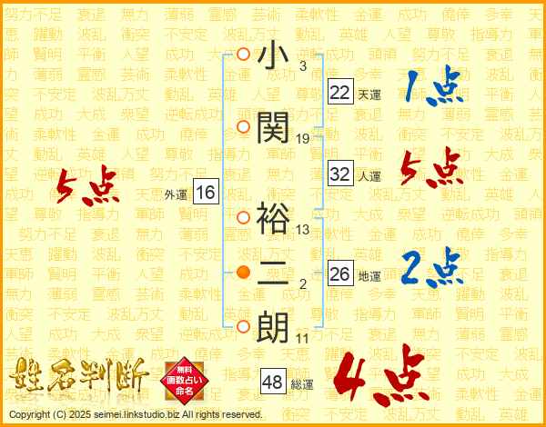 小(3画)関(19画) 裕(13画)二(2画)朗(11画)