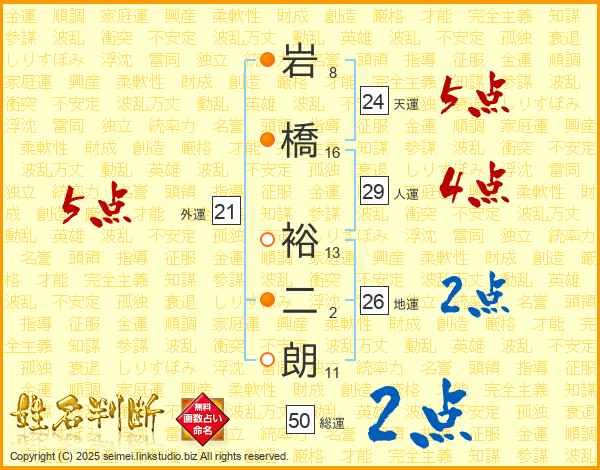 岩(8画)橋(16画) 裕(13画)二(2画)朗(11画)