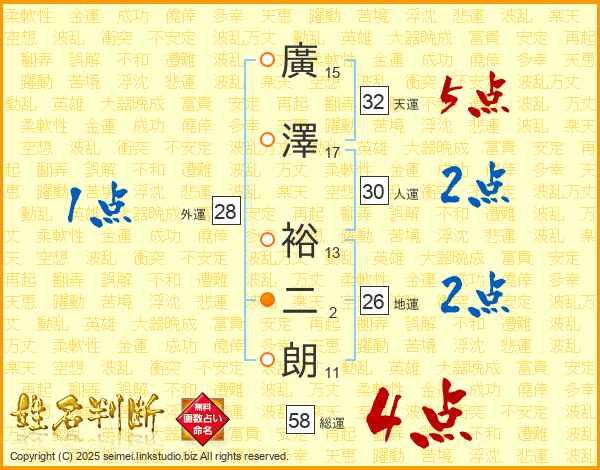 廣澤裕二朗さんの総運は58画の4点!