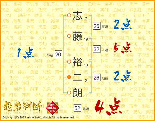 志(7画)藤(19画) 裕(13画)二(2画)朗(11画)
