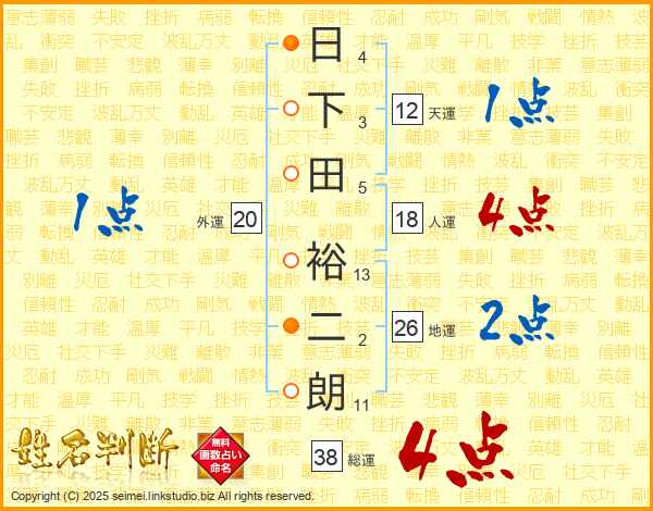 日(4画)下(3画)田(5画) 裕(13画)二(2画)朗(11画)