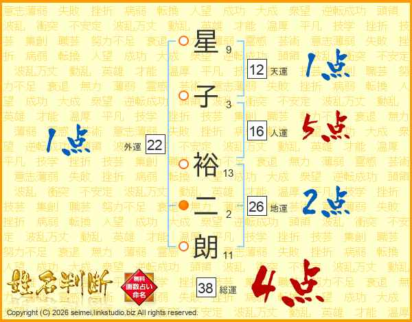 星(9画)子(3画) 裕(13画)二(2画)朗(11画)