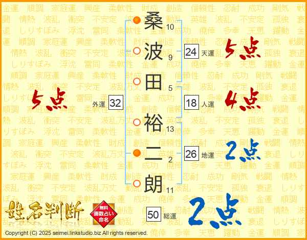 桑(10画)波(9画)田(5画) 裕(13画)二(2画)朗(11画)