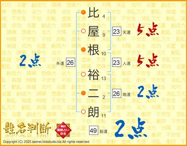 比(4画)屋(9画)根(10画) 裕(13画)二(2画)朗(11画)