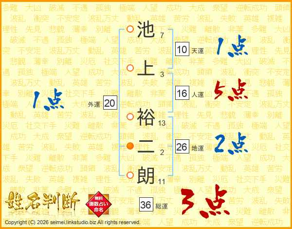 池(7画)上(3画) 裕(13画)二(2画)朗(11画)