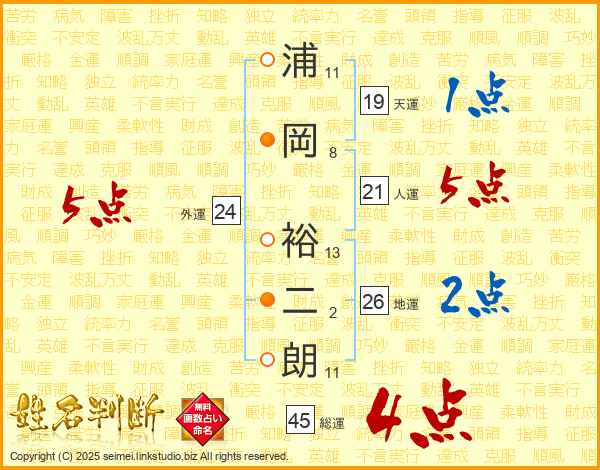 浦(11画)岡(8画) 裕(13画)二(2画)朗(11画)