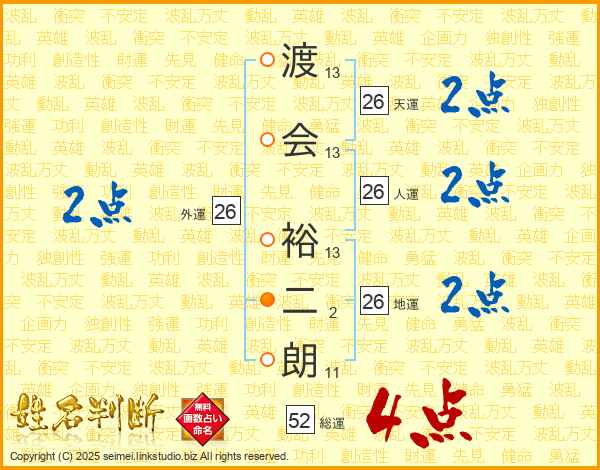 渡(13画)会(13画) 裕(13画)二(2画)朗(11画)