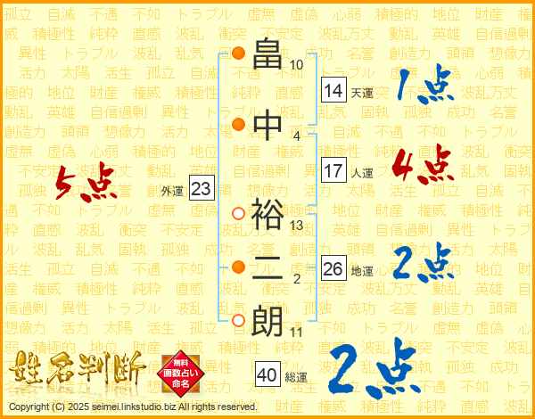畠(10画)中(4画) 裕(13画)二(2画)朗(11画)