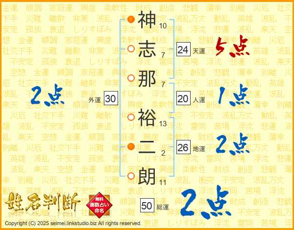 神(10画)志(7画)那(7画) 裕(13画)二(2画)朗(11画)