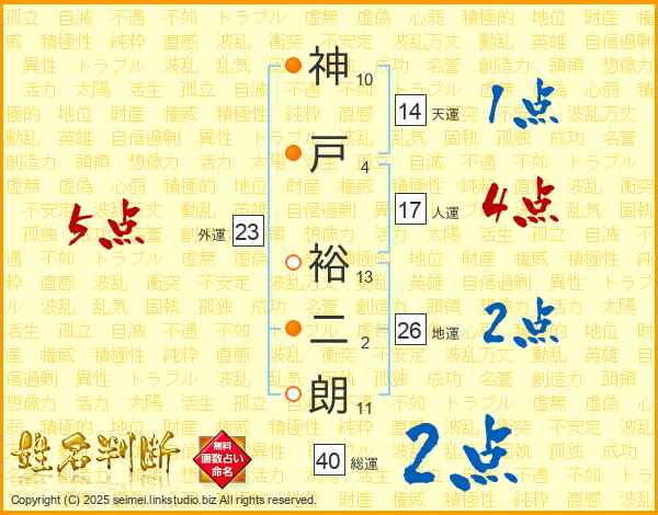 神(10画)戸(4画) 裕(13画)二(2画)朗(11画)