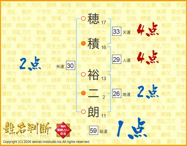 穂(17画)積(16画) 裕(13画)二(2画)朗(11画)