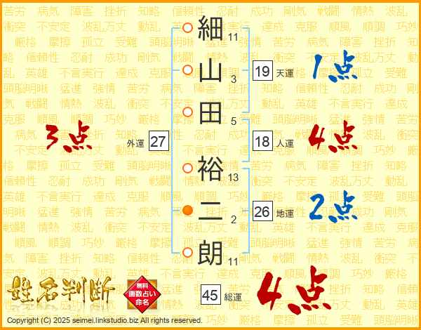 細(11画)山(3画)田(5画) 裕(13画)二(2画)朗(11画)