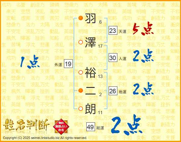羽(6画)澤(17画) 裕(13画)二(2画)朗(11画)