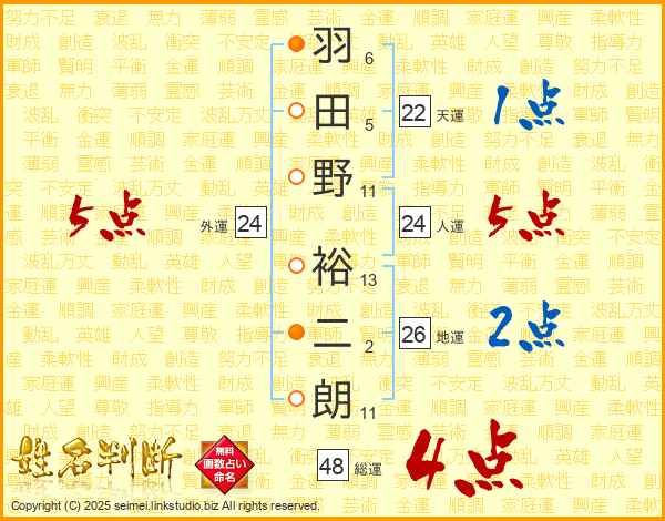 羽(6画)田(5画)野(11画) 裕(13画)二(2画)朗(11画)
