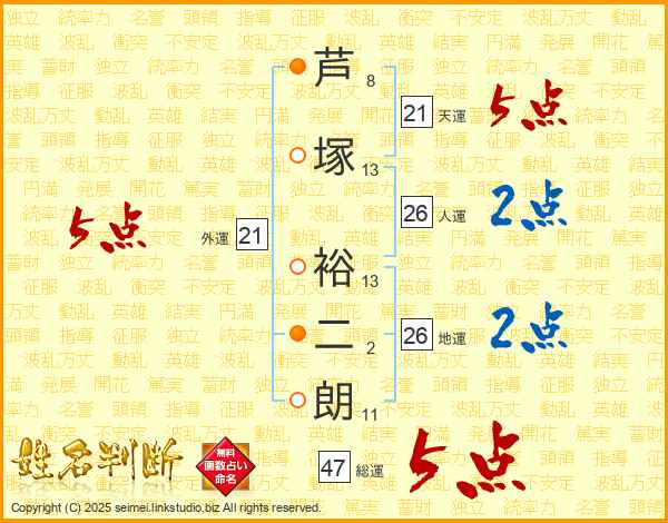 芦(8画)塚(13画) 裕(13画)二(2画)朗(11画)