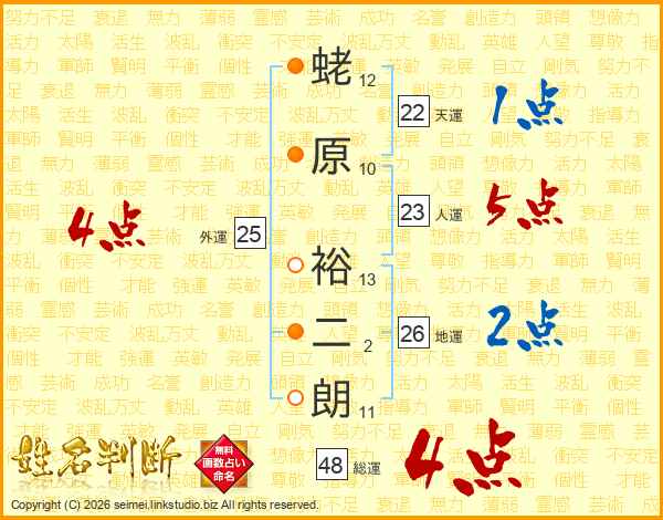 あなたの人生を表す1番重要な運勢です。生涯を通じて影響する総合運となり、主に50歳以降の晩年期に影響を及ぼします。苗字と名前の合計画数。