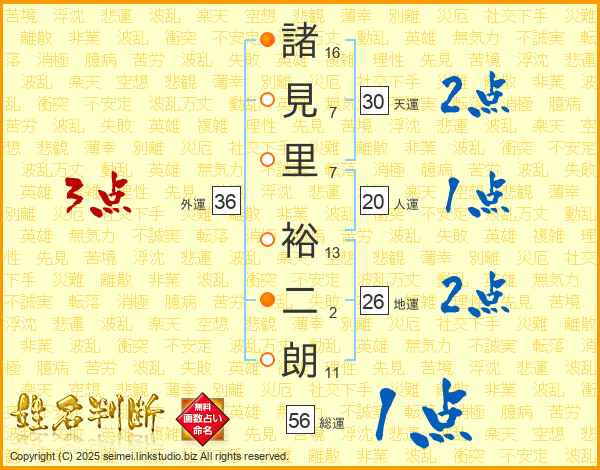 諸(16画)見(7画)里(7画) 裕(13画)二(2画)朗(11画)