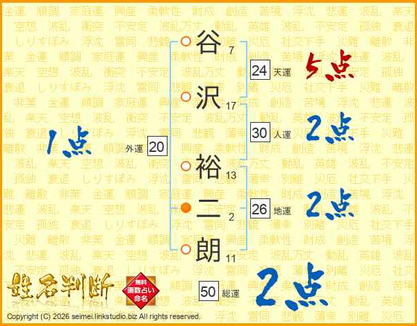 谷(7画)沢(17画) 裕(13画)二(2画)朗(11画)