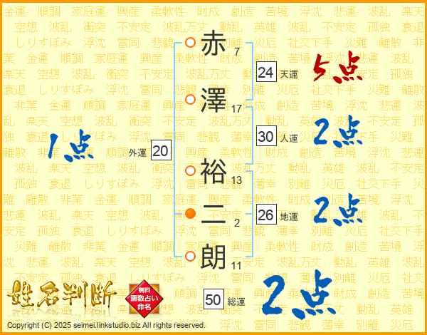 赤(7画)澤(17画) 裕(13画)二(2画)朗(11画)