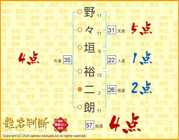 野(11画)々(11画)垣(9画) 裕(13画)二(2画)朗(11画)
