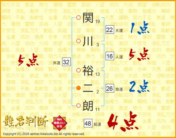 関(19画)川(3画) 裕(13画)二(2画)朗(11画)