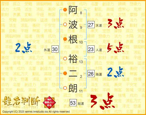 阿(8画)波(9画)根(10画) 裕(13画)二(2画)朗(11画)