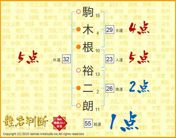 駒(15画)木(4画)根(10画) 裕(13画)二(2画)朗(11画)