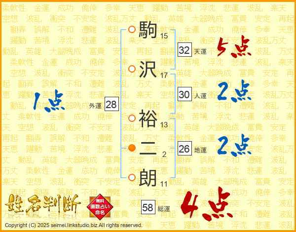駒(15画)沢(17画) 裕(13画)二(2画)朗(11画)