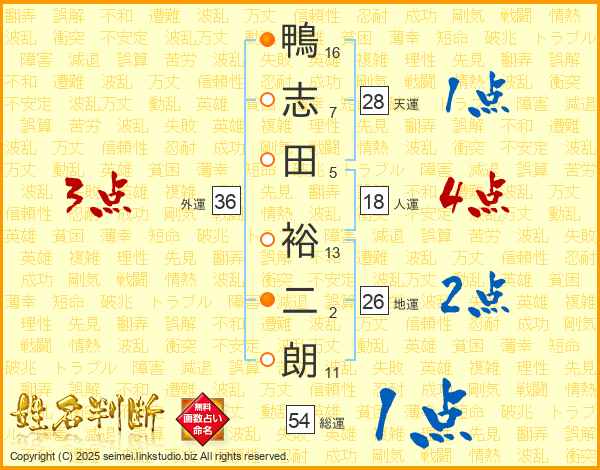 鴨(16画)志(7画)田(5画) 裕(13画)二(2画)朗(11画)