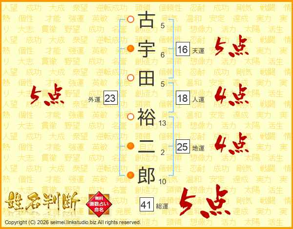 古宇田裕二郎さんの総運は41画の5点!