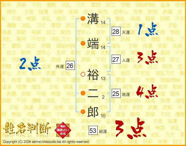 溝(14画)端(14画) 裕(13画)二(2画)郎(10画)