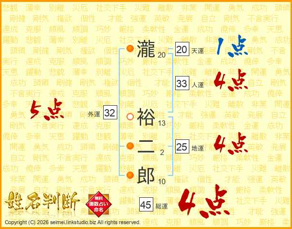 瀧(20画) 裕(13画)二(2画)郎(10画)