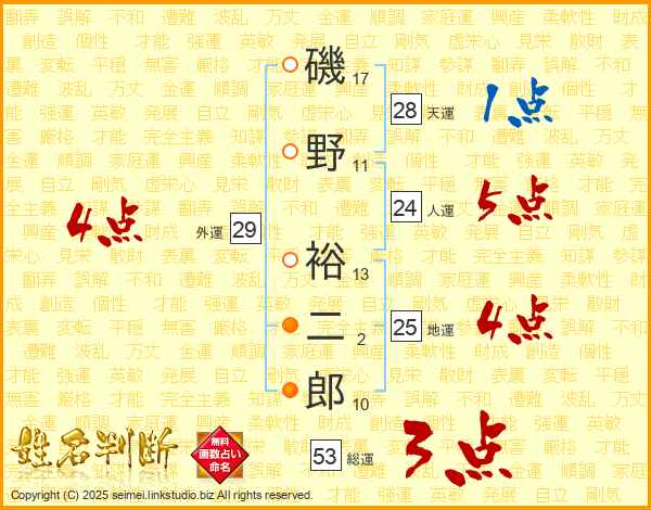 磯(17画)野(11画) 裕(13画)二(2画)郎(10画)