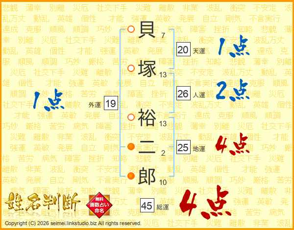 貝塚裕二郎さんの総運は45画の4点!