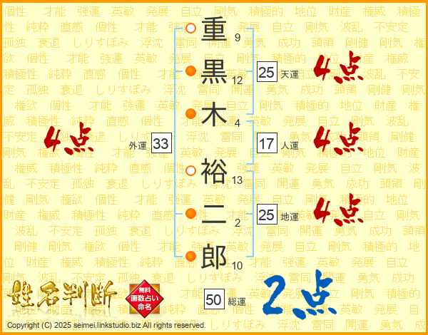 重(9画)黒(12画)木(4画) 裕(13画)二(2画)郎(10画)