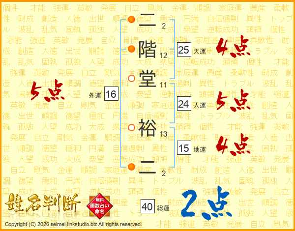 二(2画)階(12画)堂(11画) 裕(13画)二(2画)