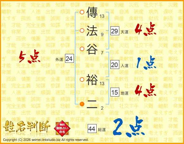 傳法谷裕二さんの総運は44画の2点!