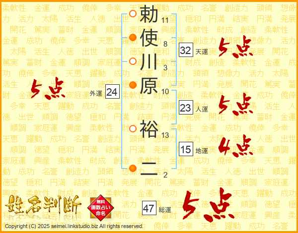 勅(11画)使(8画)川(3画)原(10画) 裕(13画)二(2画)