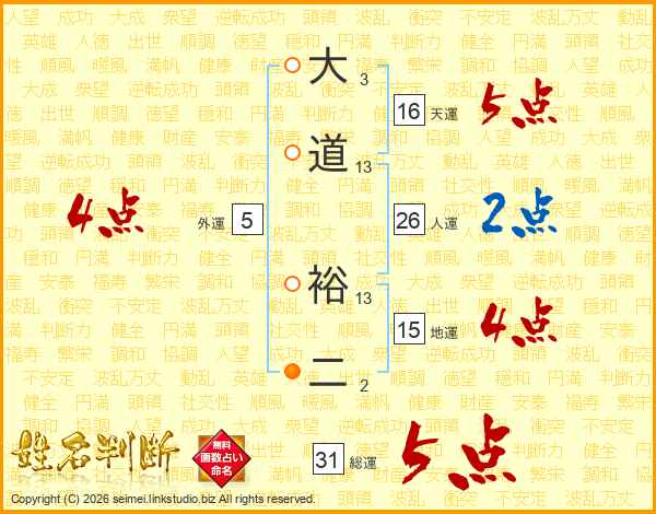 あなたの人生を表す1番重要な運勢です。生涯を通じて影響する総合運となり、主に50歳以降の晩年期に影響を及ぼします。苗字と名前の合計画数。
