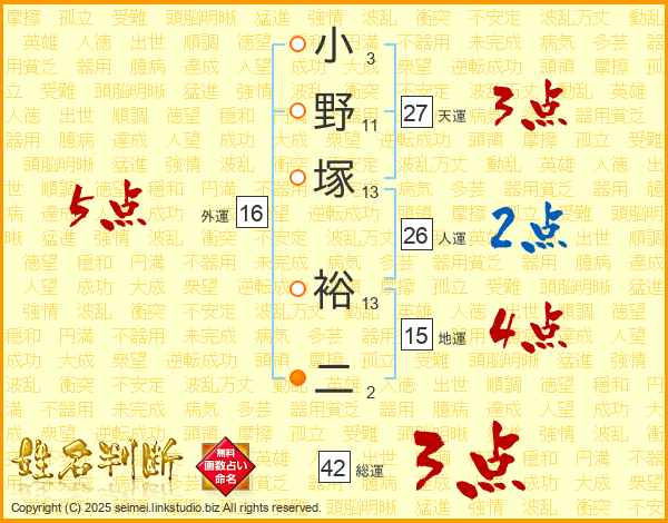 小(3画)野(11画)塚(13画) 裕(13画)二(2画)
