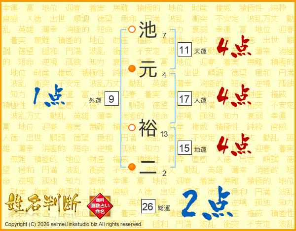 生活面を象徴する運勢です。外部から受ける影響力を表し、結婚運、家庭運や職場、環境への順応性を表します。総運から人運を引いた画数。姓や名が1文字の場合を除く。