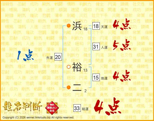 あなたの人生を表す1番重要な運勢です。生涯を通じて影響する総合運となり、主に50歳以降の晩年期に影響を及ぼします。苗字と名前の合計画数。