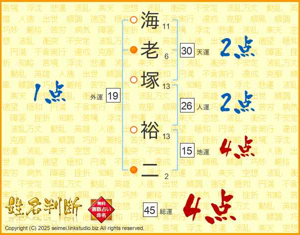 海(11画)老(6画)塚(13画) 裕(13画)二(2画)