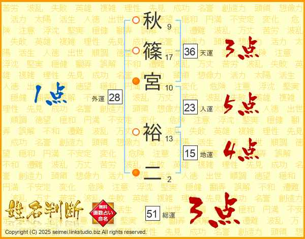 秋(9画)篠(17画)宮(10画) 裕(13画)二(2画)