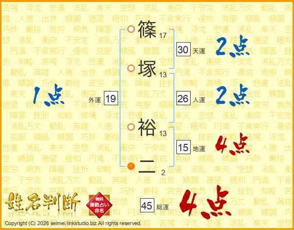 篠(17画)塚(13画) 裕(13画)二(2画)