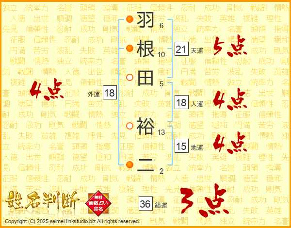羽(6画)根(10画)田(5画) 裕(13画)二(2画)