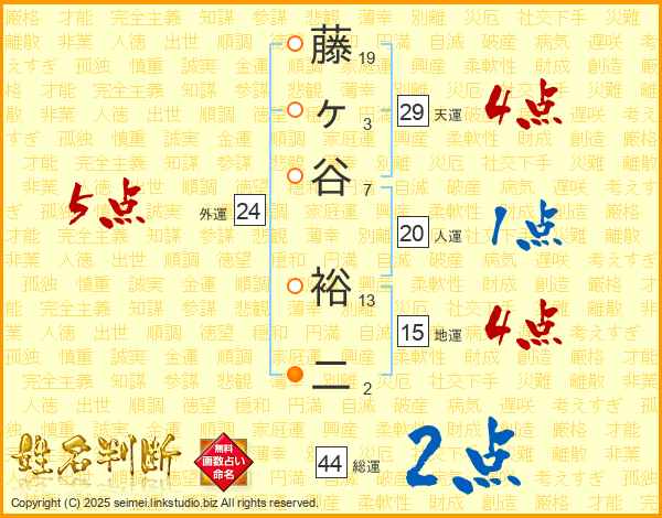 藤(19画)ヶ(3画)谷(7画) 裕(13画)二(2画)
